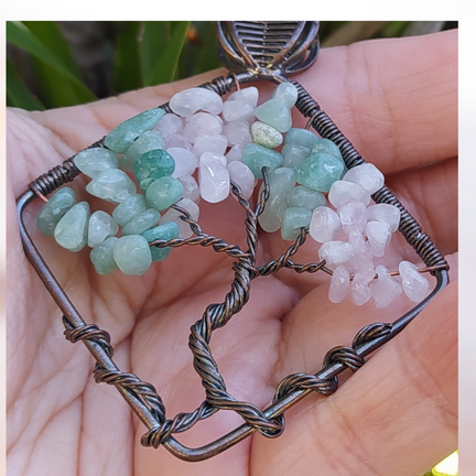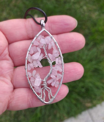 Pendente oval (5X3cm) de arame prateado com cascalho natural de quartzo Rosa .