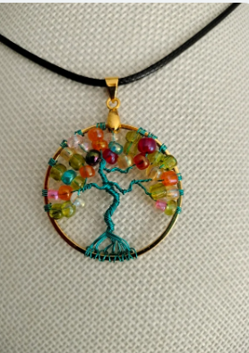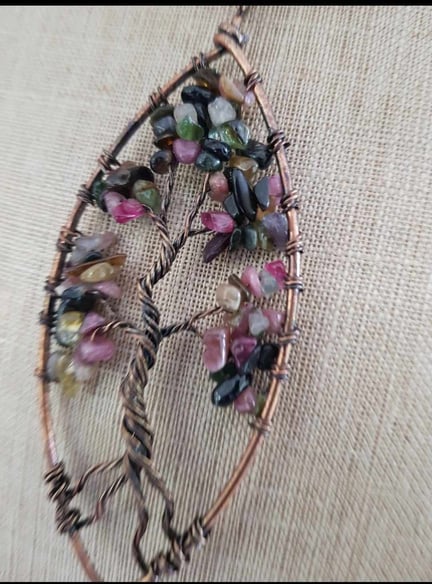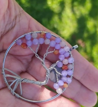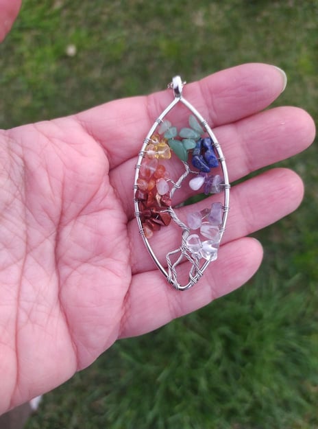Pendente oval (5X3cm) de arame prateado com cascalho natural: Pedra do Sol, cornalina, citrino, jade, Selenita, ametista e quarto