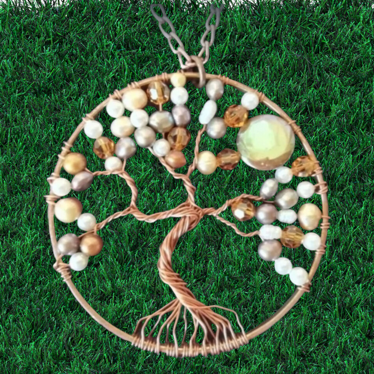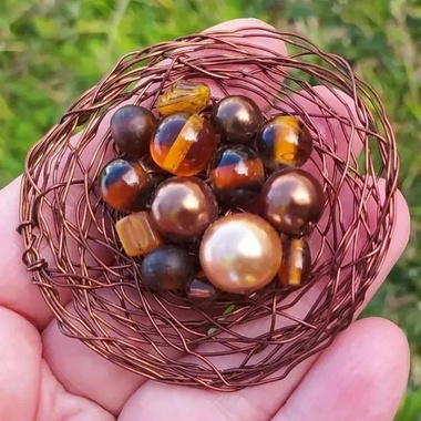 Pendente circular em arame castanho (5cm) trabalhado com contas em vidro e pérolas.