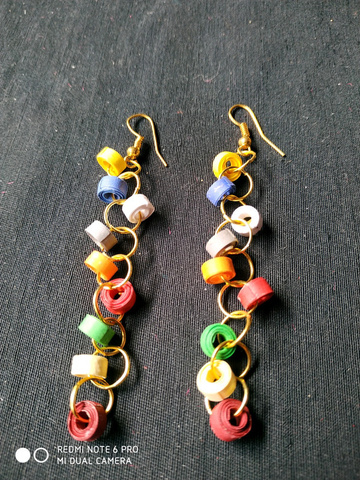 Brincos em arame ouro velho com rolinhos de papel coloridos