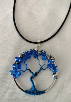 Pendente circular (3,5cm) de arame prateado e azul metálico com contas de vidro e acrílicas:
