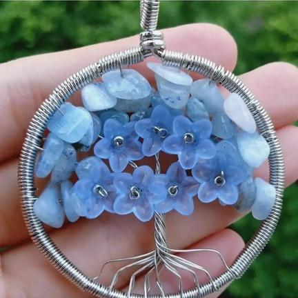 Pendente (5cm) de arame prateado com cascalho natural quartzo azul com flores acrílicas.