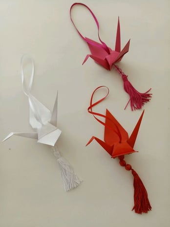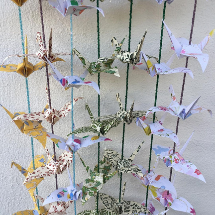 Fio de origami simples (só linha) com tsurus dobrados em folha lisa de uma só cor