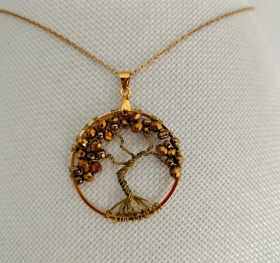 Pendente circular (3,5cm) de arame dourado e castanho metálico com contas de vidro e acrílicas: