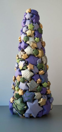 Árvore de natal em cone coberta de estrelas da sorte em origami.